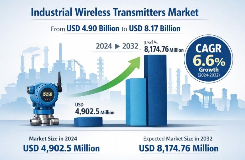 The global Industrial Wireless Transmitters Market has emerged as a critical enabler of next-generation industrial operations, reflecting the accelerating adoption of automation, digitalization, and Industrial Internet of Things (IIoT) technologies. Valued at USD 4,902.5 million in 2024, the market is projected to reach USD 8,174.76 million by 2032, registering a compound annual growth rate (CAGR) of 6.6% during the forecast period (2024-2032). This growth trajectory underscores the increasing reliance on wireless instrumentation to enhance operational efficiency, reduce infrastructure costs, and enable real-time decision-making across diverse industrial environments.