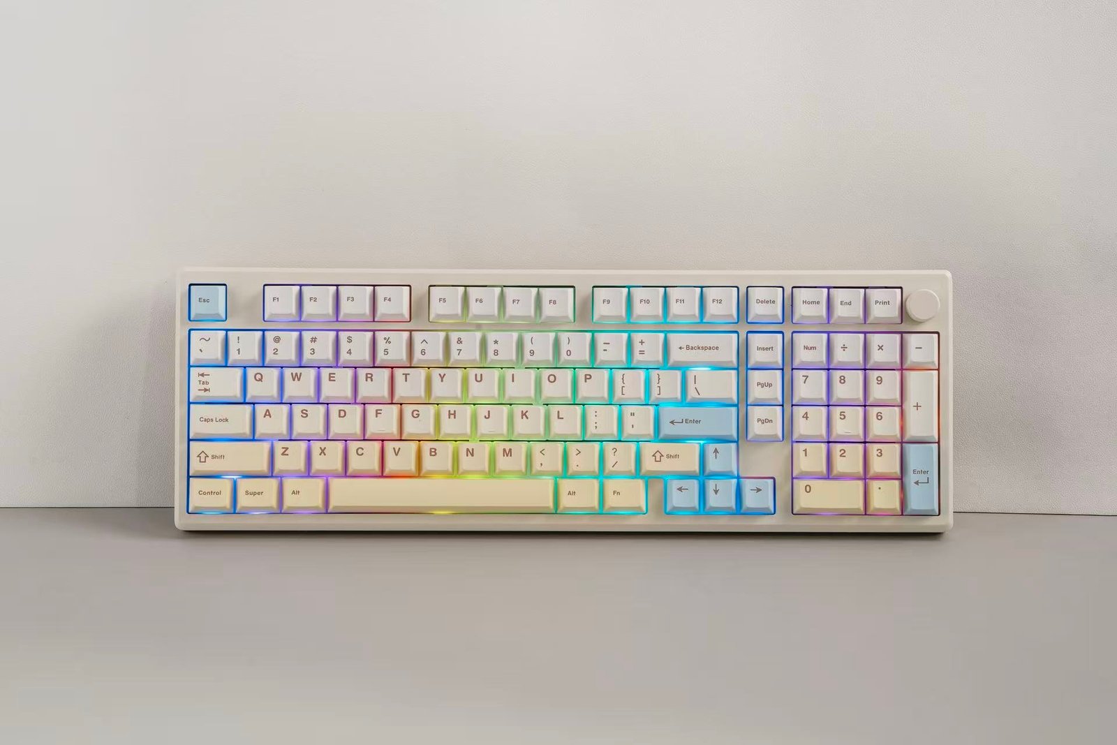 Moving beyond the conventional neutral business aesthetic, the Galaxy100 Lite introduces dual-gradient color schemes for a more recognizable look. The white variant features a milky white casing accented by yellow gradient keycaps, transitioning from milk white to soft pale yellow, with scattered light blue keycaps that evoke the gentle breeze under warm sunlight, adding a refreshing touch to the overall palette. The black variant presents a navy-to-gray gradient, reflecting a refined, futuristic minimalism that aligns with the modern preference for clean and stylish design.