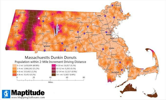 “Maptitude empowers people to explore and communicate geographic patterns in ways that resonate with everyday audiences,” said Stewart Berry, VP, Maptitude. “A map like this brings the data to life in an instant. It’s one thing to say that Dunkin’ is everywhere in Massachusetts, but showing it visually makes the story undeniable.”