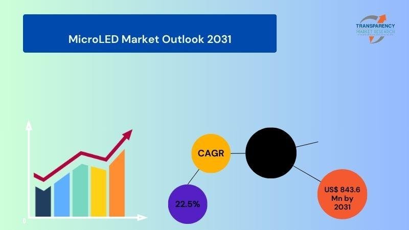 The MicroLED market is projected to reach a valuation of USD 843.6 million by 2031, expanding at a robust CAGR of 22.5% during the forecast period from 2024 to 2034.