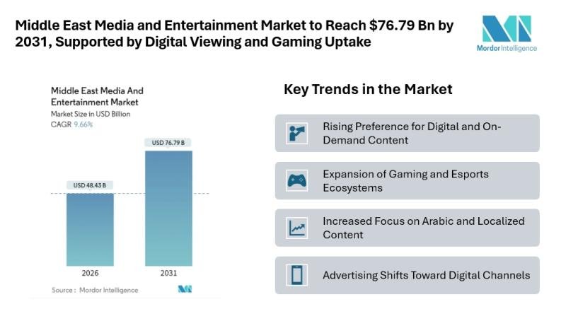 The Middle East Media and Entertainment Market [https://www.mordorintelligence.com/industry-reports/middle-east-media-and-entertainment-market?utm_source=abnewswire] continues to show steady expansion as digital viewing habits, gaming adoption, and locally produced content gain stronger traction across the region. According to Mordor Intelligence, the market size is estimated at USD 48.43 billion in 2026, rising from USD 44.16 billion in 2025, and is projected to reach USD 76.79 billion by 2031, supported by a healthy growth rate during the forecast period.