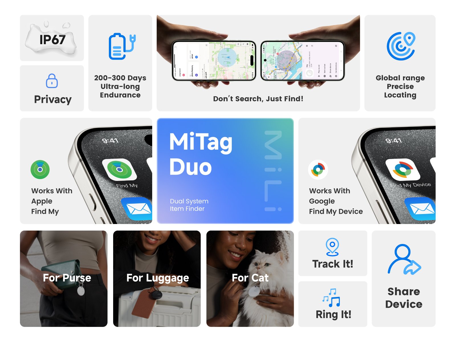 Shenzhen, China, March 24, 2025 (GLOBE NEWSWIRE) — MiLi, a leader in smart accessories with over 20 years of innovation, is redefining Bluetooth tracking with MiTag Duo—the first tracker officially licensed by both Apple and Google in one single device. MiLi has forged partnerships with over 100 airlines and holds more than 100 patents, blending cutting edge design with real world functionality. Unlike trackers tied to a single platform, MiTag Duo seamlessly connects to the Apple Find My or Google Find My Device app right out of the box—giving users true cross-platform freedom. This pioneering device reflects MiLi’s commitment to reliability, user-focused solutions, and making everyday life easier.