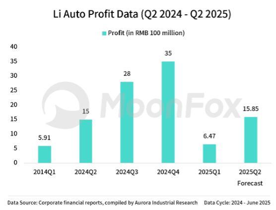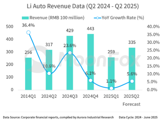 According to financial modelling by MoonFox, Li Auto’s revenue for Q2 2025 is projected at RMB 33.5 billion, representing a YoY increase of 5.6%, with growth slowing by 4.96%.