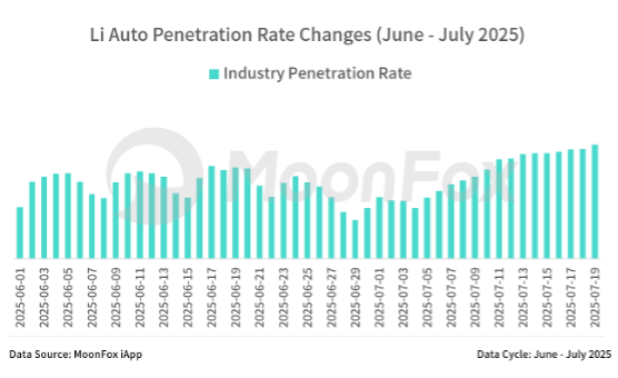 According to MoonFox Data, following the announcement of i8 pre-orders, Li Auto’s app saw a continued increase in online penetration rate, reflecting strong market enthusiasm.