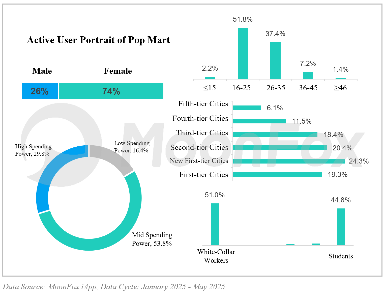 According to Pop Mart’s active user portrait, the core consumer group consists primarily of women aged 16 to 35, with Generation Z and young white-collar workers as the dominant force. These users are mainly concentrated in first- and second-tier cities with developed consumer markets. They are highly receptive to new trends, willing to pay for emotional value, possess a certain level of economic stability, and demonstrate strong purchasing intent. As both primary buyers and key nodes in social sharing, they play a central role in driving consumption and brand communication.