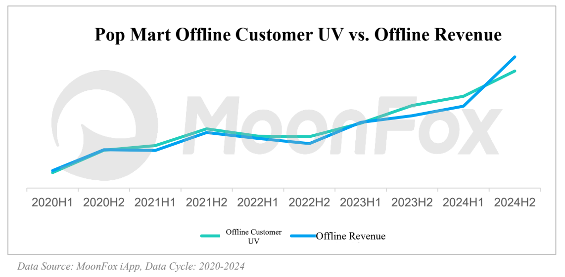 Retail Stores: By the end of 2024, Pop Mart had opened 401 stores across Mainland China, primarily located in high-traffic commercial districts. With an emphasis on immersive store design, each outlet serves not just as a point of sale but also as a powerful channel for brand storytelling and customer engagement. According to MoonFox Data, the offline customer UV index in 2024 increased by 47.7% YoY, showing a strong correlation with in-store revenue.