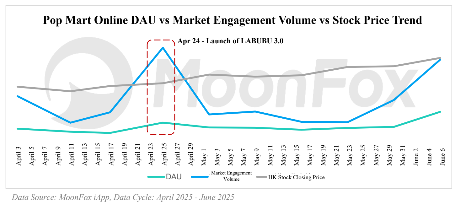Additionally, following the online release of LABUBU 3.0 on April 24, Pop Mart saw an explosive short-term spike in market buzz and DAU, which was soon followed by a sustained upward trend in its share price, with growth momentum significantly accelerating in June.