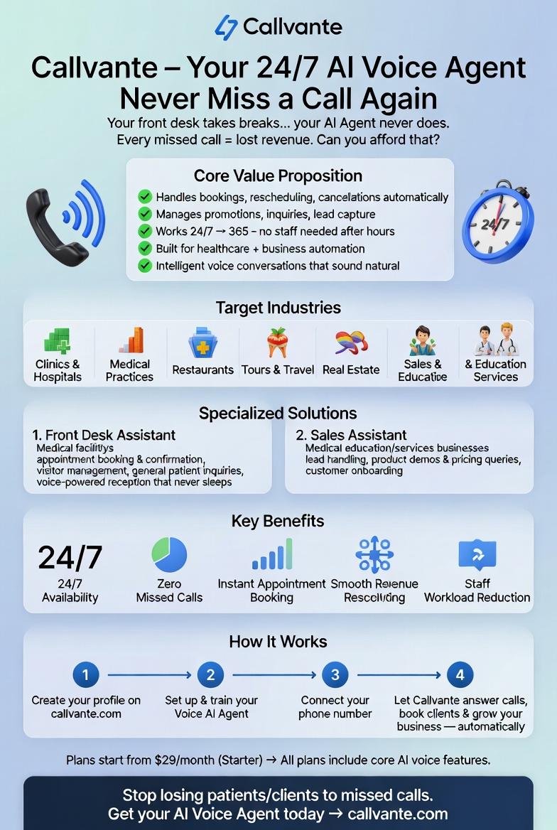 Callvante (from “Call” + “Vante” meaning forward-thinking innovation) is a next-generation SaaS platform that empowers businesses with intelligent AI voice agents. From healthcare clinics and restaurants to real estate agencies, gyms, retail, and travel companies – Callvante automates bookings, promotions, customer queries, and engagement so businesses never miss an opportunity.