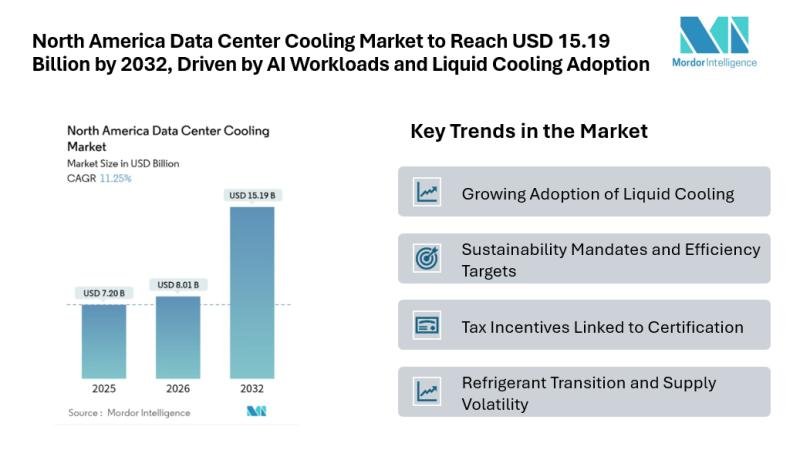 According to Mordor Intelligence, the North America data center cooling market is expected to grow from USD 7.2 billion in 2025 to USD 8.01 billion in 2026 and is forecast to reach USD 15.19 billion by 2032, registering a CAGR of 11.25% during 2026-2032. This steady rise reflects changing compute patterns, higher rack densities, and stricter energy performance requirements across the region. The industry is entering a new phase as artificial intelligence infrastructure expands across hyperscale and colocation facilities. Operators are redesigning cooling systems to manage higher heat loads while meeting power usage effectiveness benchmarks.