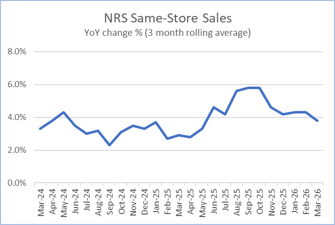 Same-store data comparisons of March 2026 with March 2025 are derived from approximately 232 million transactions processed through the approximately 25,000 stores on the NRS network that scanned transactions in both months. Same-store data comparisons of March 2026 with February 2026 are derived from approximately 261 million transactions processed through approximately 32,700 stores.
