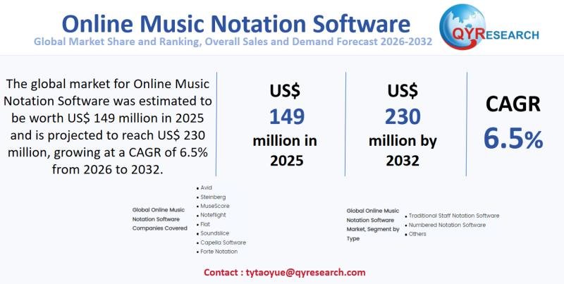 The global market for Online Music Notation Software was estimated to be worth US$ 149 million in 2025 and is projected to reach US$ 230 million, growing at a CAGR of 6.5% from 2026 to 2032.