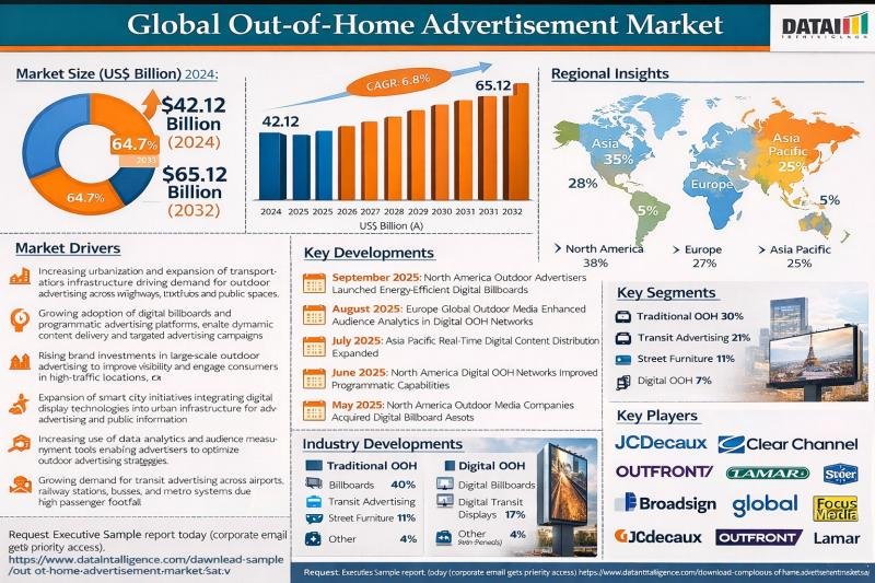 The global Out-of-Home (OOH) Advertisement market reached US$42.12 billion in 2024 and is expected to reach US$65.12 billion by 2032, expanding at a CAGR of 6.8% during the forecast period 2025-2032.