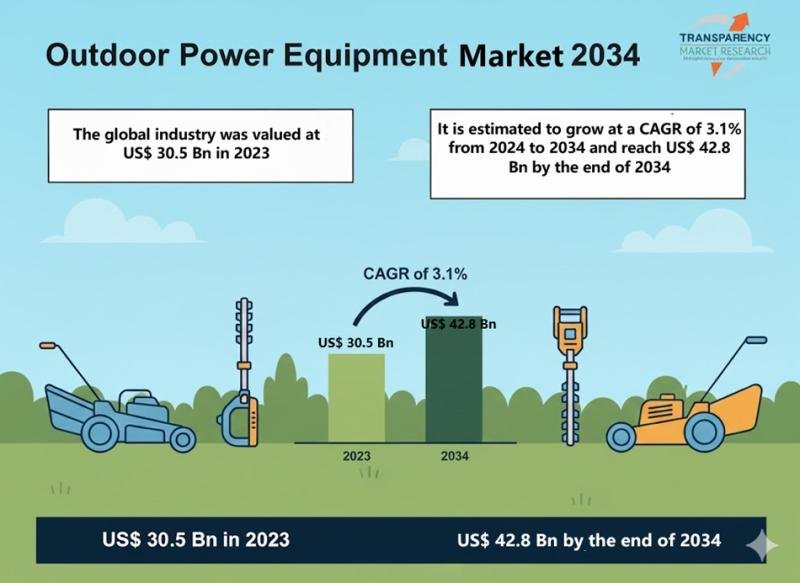 The global outdoor power equipment (OPE) market is entering a phase of sustained expansion, supported by rising landscaping activities, urban development, and consumer investment in home improvement. Valued at US$ 30.5 billion in 2023, the market is projected to grow at a CAGR of 3.1% from 2024 to 2034, ultimately reaching US$ 42.8 billion by 2034. Outdoor power equipment-including lawn mowers, chainsaws, leaf blowers, trimmers, pressure washers, snow blowers, and garden tools-has become indispensable for residential, commercial, and municipal maintenance. The shift toward efficient, low-noise, and sustainable equipment is shaping market dynamics as consumers, landscapers, and facility managers seek tools that deliver power, precision, and environmental compliance.