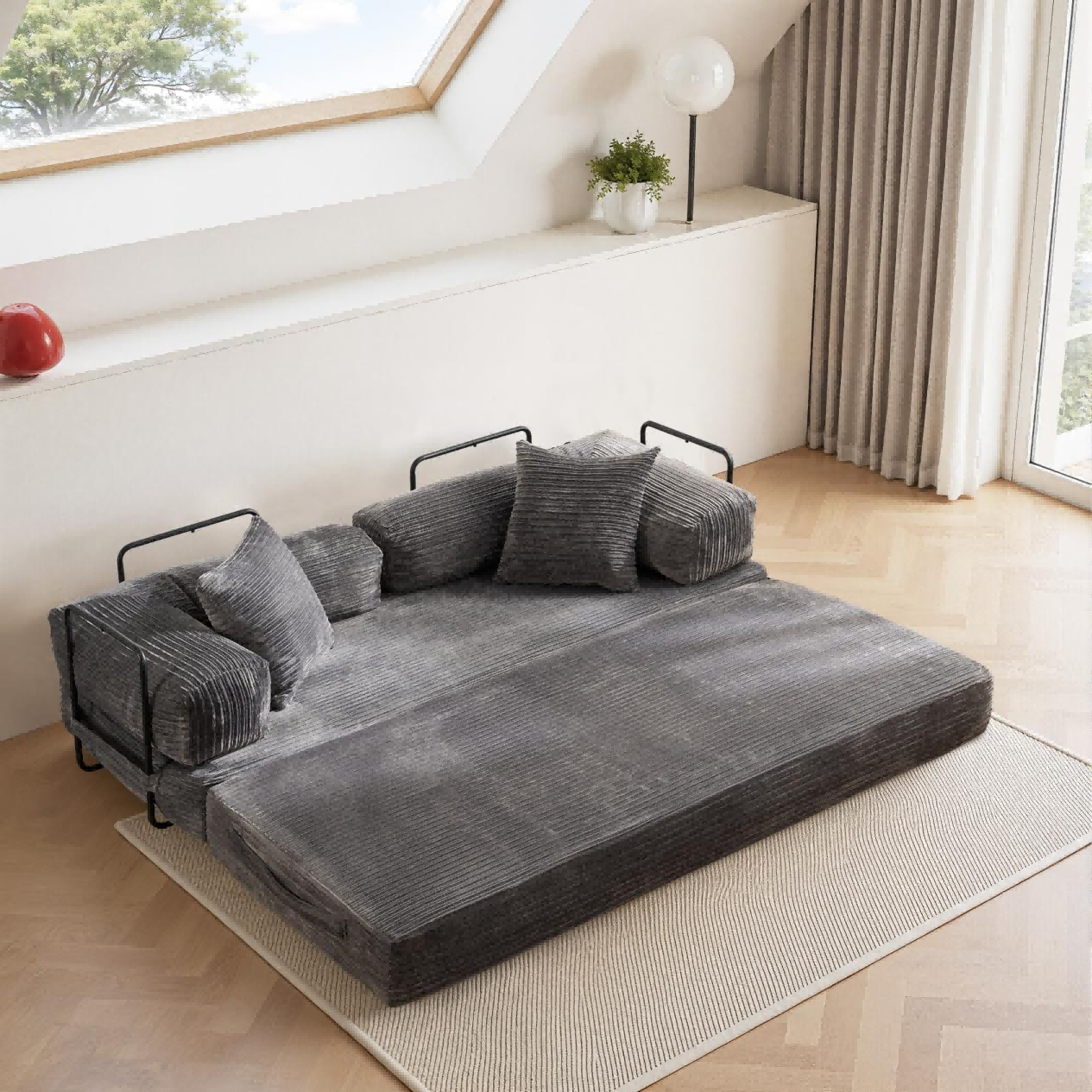 Designed for today’s hybrid spaces, it works as a living room couch, temporary bed, or even a kids’ play zone.