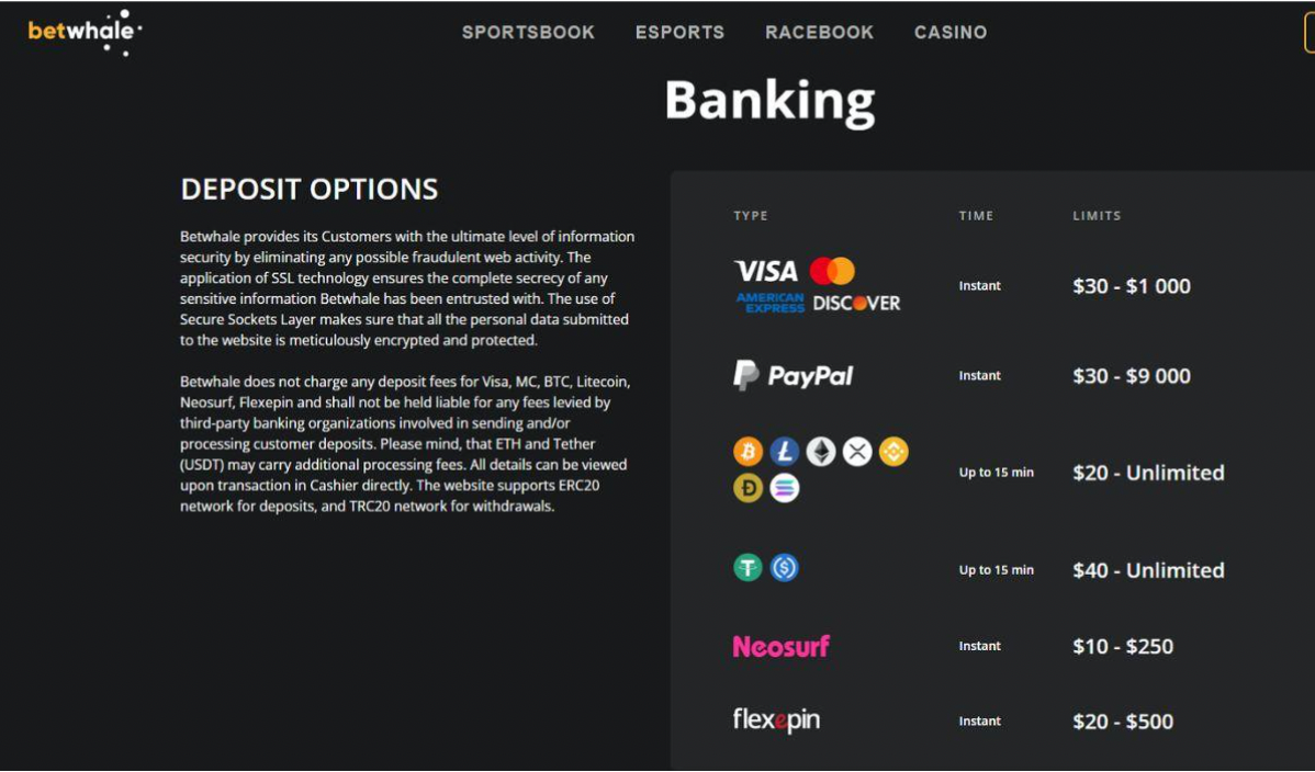 All the payment methods supported by BetWhale offer 100% encrypted and safe transactions. However, not every payment method suits every online sports bettor. By categorising the banking methods offered, players can easily choose a method that suits their betting style.