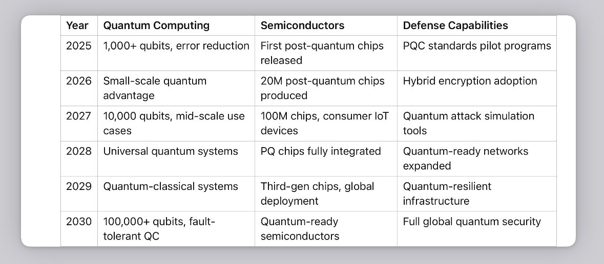 Here is a 6-year timeline (2025–2030) for developing a fully operational quantum computer, alongside the SEALSQ advancements for developing post-quantum chips and post-quantum computing defense capabilities and the generation of a Quantum RootKey by WISeKey.