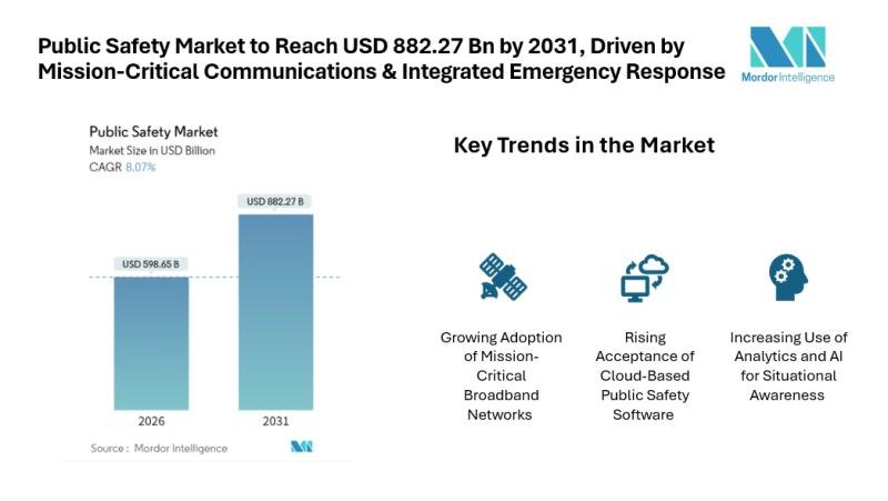 The Public Safety Market continues to expand as governments and public agencies focus on protecting citizens, infrastructure, and critical services amid rising security concerns and climate-related emergencies. According to Mordor Intelligence, the market is valued at USD 553.95 billion in 2025, estimated at USD 598.65 billion in 2026, and projected to reach USD 882.27 billion by 2031. The shift toward integrated platforms that combine communications, analytics, and incident management is strengthening the Public Safety Market Size while improving operational efficiency.