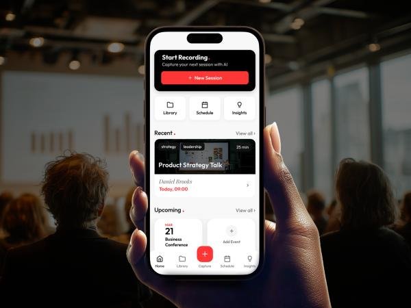 The application also includes a built-in session planner that allows users to pre-configure their event agenda with session titles, times, and speakers. Recording can then be started directly from the schedule, eliminating setup friction between back-to-back sessions. At the end of an event day, all sessions are automatically labeled, organized, and ready for review. Over time, the app builds a personal knowledge library that is fully searchable, enabling users to retrieve specific content from past events weeks or months later.