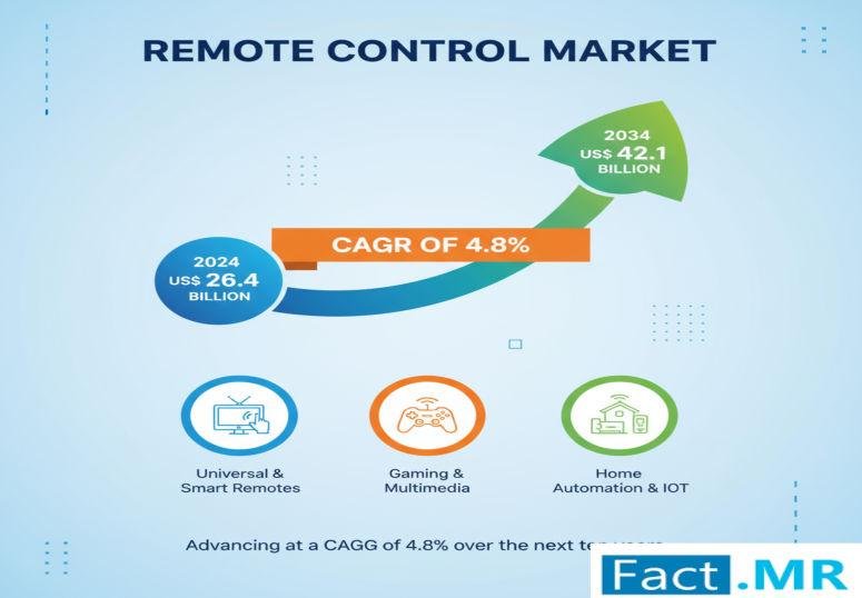 The global remote control market is on a steady growth trajectory, underpinned by rapid technological advancements and the growing penetration of smart consumer electronics. According to the latest projections by Fact.MR, the market, valued at USD 26.4 billion in 2024, is expected to expand at a CAGR of 4.8% during the forecast period from 2024 to 2034, reaching USD 42.1 billion by the end of 2034. As households and industries increasingly adopt automation and connectivity-driven solutions, remote controls are playing a vital role in bridging human interaction with electronic devices.
