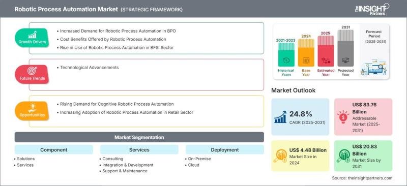 The robotic process automation market size is expected to reach US$ 20.83 billion by 2031 from US$ 4.48 billion in 2024. The market is estimated to record a CAGR of 24.8% during 2025-2031. The growing technological advancement is likely to bring new trends in the market in the coming years.