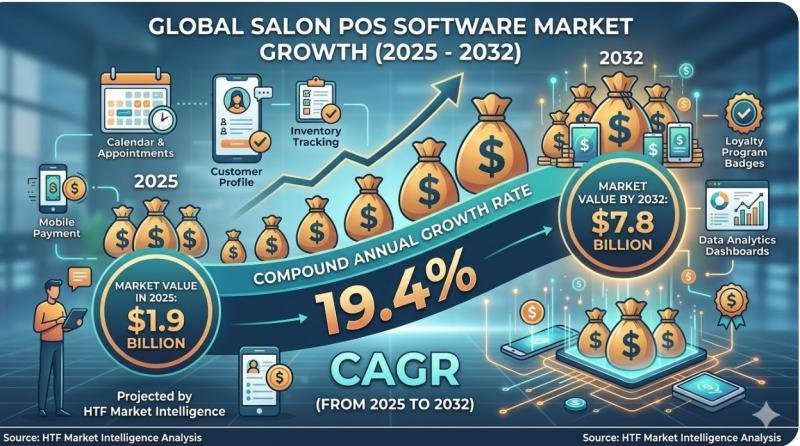 HTF Market Intelligence projects that the global Salon POS Software market will expand at a compound annual growth rate (CAGR) of 19.4 % from 2025 to 2032, from 1.9 Billion in 2025 to 7.8 Billion by 2032.