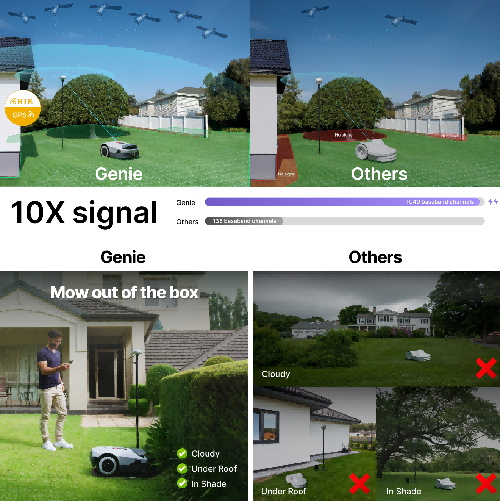 Its Full-Band RTK technology delivers 10x the signal strength and refresh rate of standard mowers. With 1,040 baseband channels, Genie maintains rock-solid connectivity even near buildings, under trees, or in bad weather.