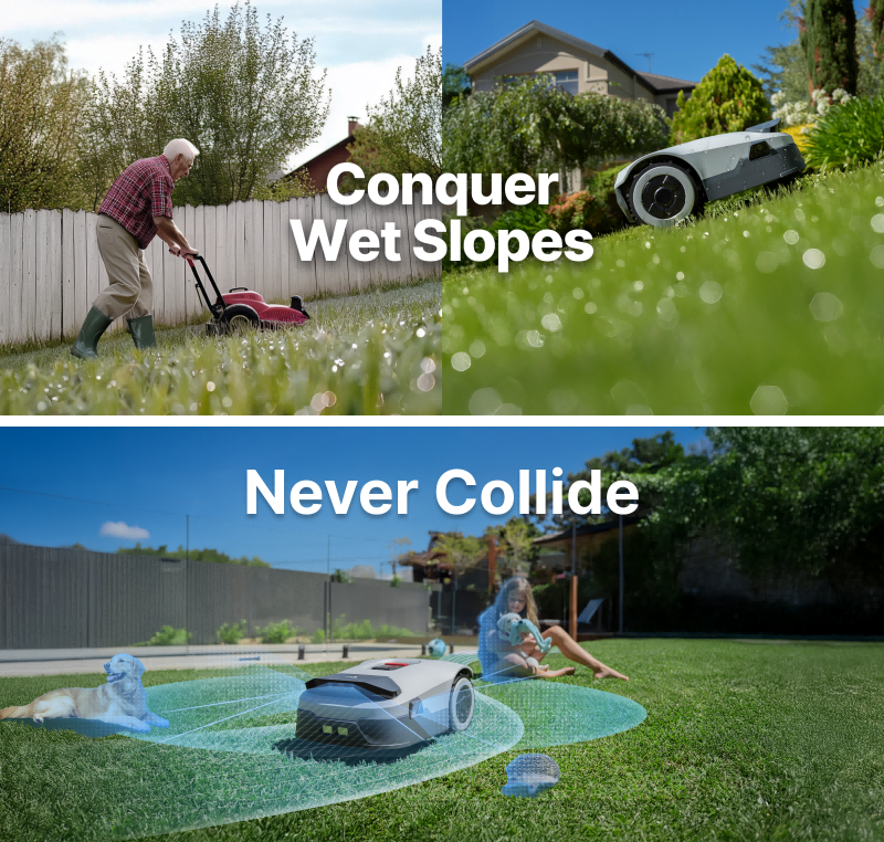 And what about terrain? Many homeowners hesitate to invest in robotic mowers because their lawns aren’t perfectly flat. Slopes, bumps, and thick patches of grass often spell disaster for conventional models, leaving homeowners to intervene and manually rescue their machines. Genie, however, is different. Featured with a powerful motor and an ultra-low center of gravity, it can easily climb slopes up to 45% (24°). It glides smoothly over uneven ground, navigating thick grass and unexpected obstacles without hesitation.