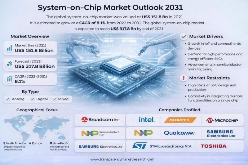 The global system-on-chip (SoC) market was valued at US$ 151.8 Bn in 2021 and is projected to expand at a compound annual growth rate (CAGR) of 8.1% from 2022 to 2031, reaching an estimated US$ 317.8 Bn by the end of 2031. Strong growth prospects are supported by rising adoption of smart and connected devices, rapid digitization, and increasing demand for compact, energy-efficient, and high-performance semiconductor solutions across industries.