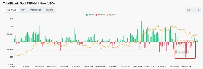 According to data from CoinGlass, Bitcoin spot ETFs have seen five consecutive weeks of outflow since February 10, totaling $5.5 billion.