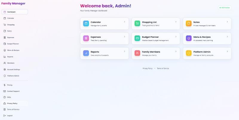 Family Manager is a unified household organization platform that simplifies family life. It combines calendars, shopping lists, expenses, budgeting, notes, recipes, messages, and AI-powered planning tools into one intelligent interface. The platform helps families reduce mental load, stay coordinated, and manage home operations with ease.