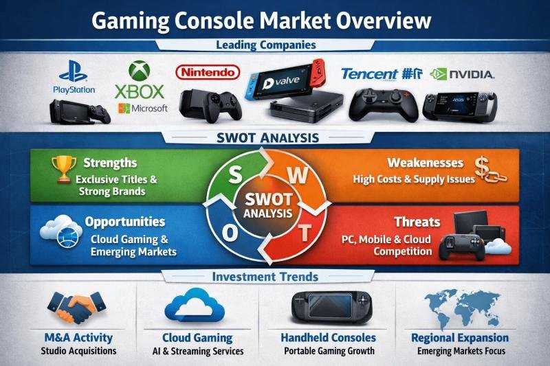 Competition in the Gaming Console Market is largely driven by innovation in hardware performance, exclusive game content, and digital distribution platforms. Established industry leaders and emerging players are reshaping the competitive landscape through strategic investments, platform ecosystems, and partnerships with developers. This article explores the top companies shaping the Gaming Console Market, analyzes their strategic strengths through a SWOT framework, and highlights key investment opportunities and trends influencing the industry.
