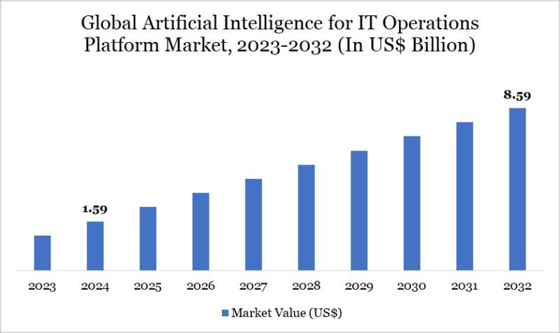 The Artificial Intelligence For IT Operations Platform Market Size reached US$1.59 billion in 2024 and is expected to reach US$8.59 billion by 2032, growing with a CAGR of 23.48% during the forecast period 2025-2032. The Market growth is driven by the increasing adoption of AI-driven analytics for automating IT operations, enhancing system performance, and reducing downtime across enterprises. According to DataM Intelligence