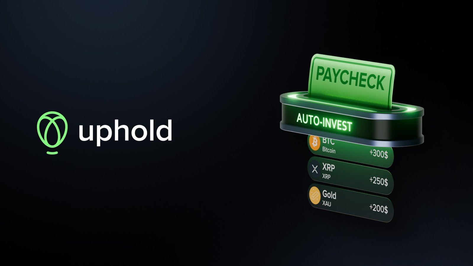 With Direct Deposit, customers receive all or part of their paycheck automatically and securely in their Uphold account. Auto-Invest lets customers buy up to ten assets automatically in a single step the moment their paycheck arrives. Customers choose from digital assets, a USD Interest Account, or metals, and then set the percentage they wish to allocate to each asset. Anything not assigned stays in their USD balance. Auto-Invest users earn 3% back in XRP on crypto trades over $500, and 2% back on trades below $500.1