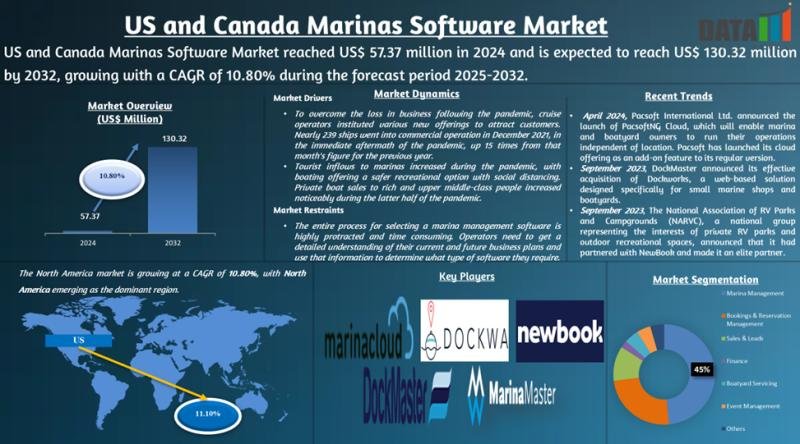 A: The US and Canada Marinas Software Market was valued at US$ 57.37 million in 2024 and is projected to surge to US$ 130.32 million by 2032