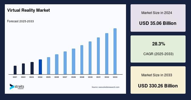 According to Straits Research, the global virtual reality market size was valued at USD 35.06 billion in 2024 and is projected to reach USD 330.26 billion by 2033, growing at a CAGR of 28.3% during the forecast period (2025-2033). The surge in adoption of immersive technologies across sectors such as healthcare, gaming, education, defense, and retail is transforming VR from a niche innovation into a mainstream technological force.