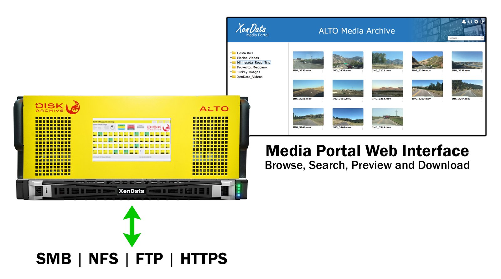 The XenData-ALTO systems may be enhanced by adding XenData Media Portal, a web interface for managing video and image files. It allows authorized users to browse the archived file system, view previews of archived video and image files and then download selected content.