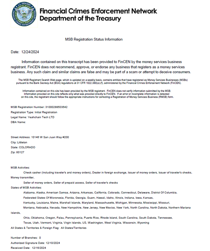In parallel, Yeahchain Exchange has further strengthened its operational controls in accordance with the Financial Crimes Enforcement Network (FinCEN) Money Services Business (MSB) registration framework. This includes enhancements to transaction record management, fund flow monitoring, and compliance-related operational procedures.